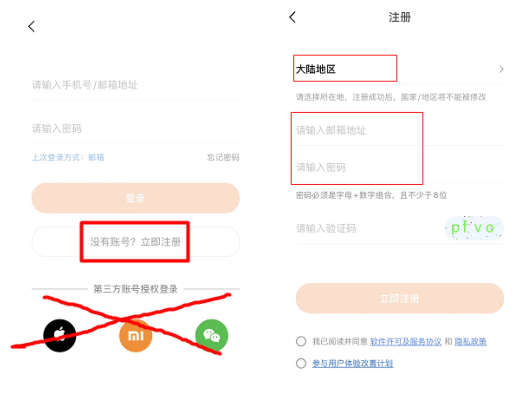 安装完成后,打开Zepp Life,点击注册,使用手机号或者邮箱注册一个账号,这里注意必须使用手机号或者邮箱注册,不可以使用第三方帐号授权登陆。(邮箱地址可以用自己的QQ邮箱格式为QQ号码@qq.com例如:12354@qq.com)