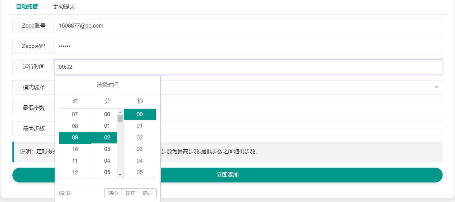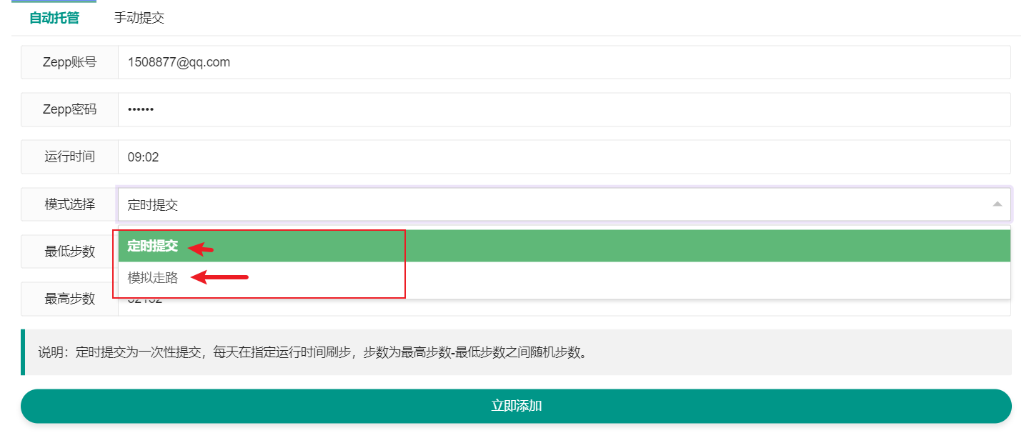 5.步数模式:定时提交为一次性提交,每天在指定运行时间刷步,步数为最高步数-最低步数之间随机步数