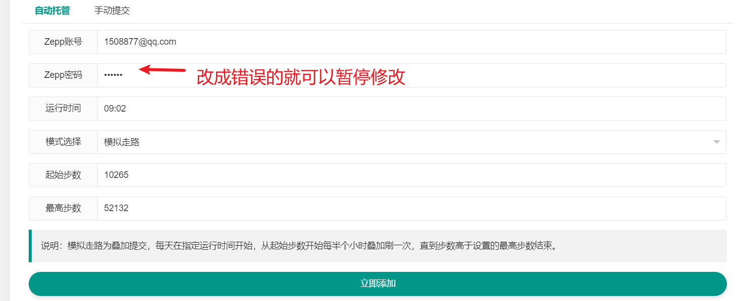 如果不想刷了,请在自动步数页面把密码删掉随便填写一个错误的密码然后点击提交